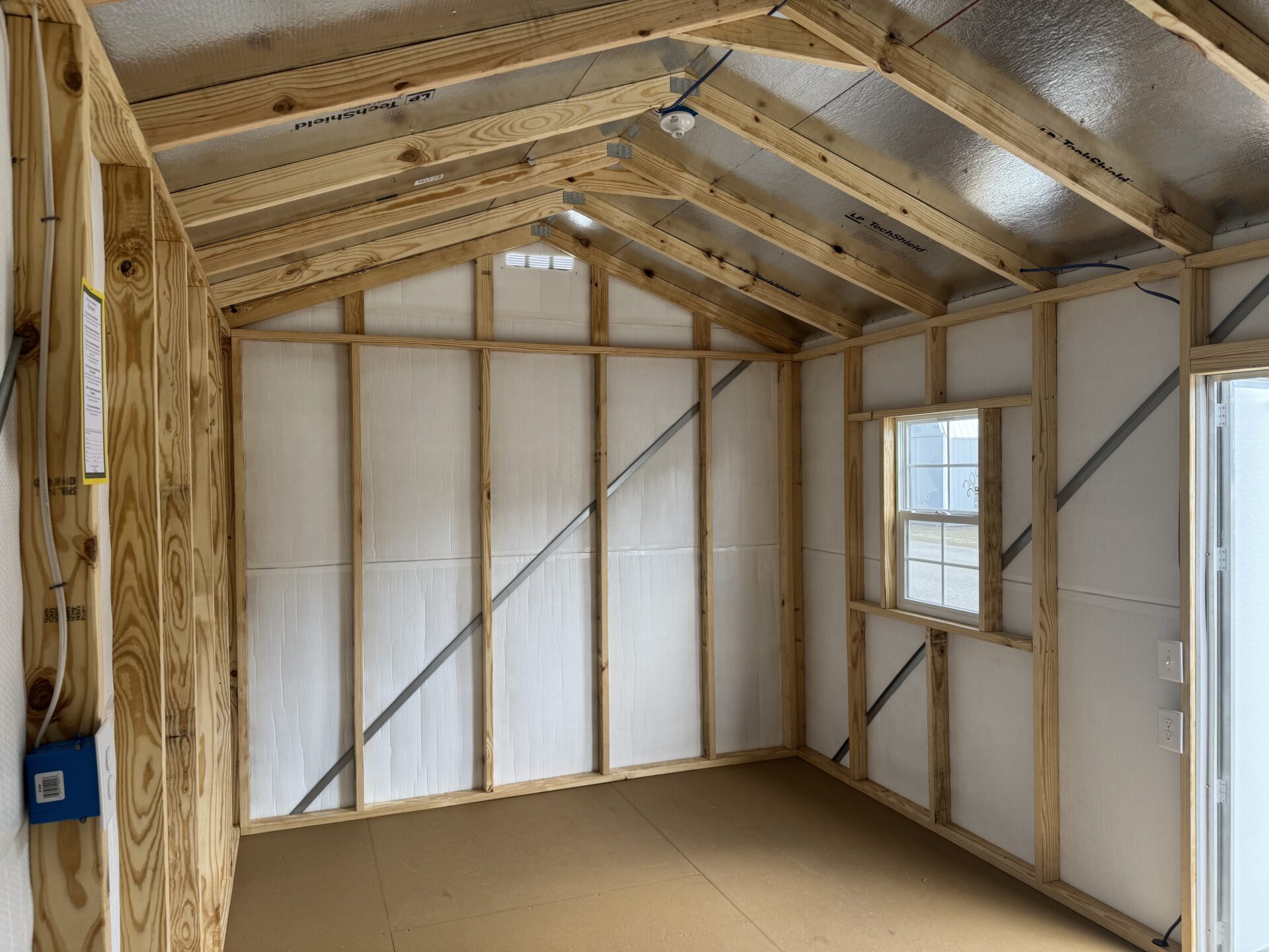 Our 10′ x 16′ Ridgeline Storage Building is one of our most popular options. This unit comes with 6.5′ interior side walls, 6′ fiberglass double door, 1 double insulated window, steel lap exterior siding, and a 40 year Evergreen Steel roof, foil bubble wrap (R14.7) walls & Floor, OSB with Techshield, SilverTech’s radiant barrier technology reduces the sun’s radiant energy, keeping building interiors cooler for storing items or working inside, and the highly-reflective surface helps brighten the interior.