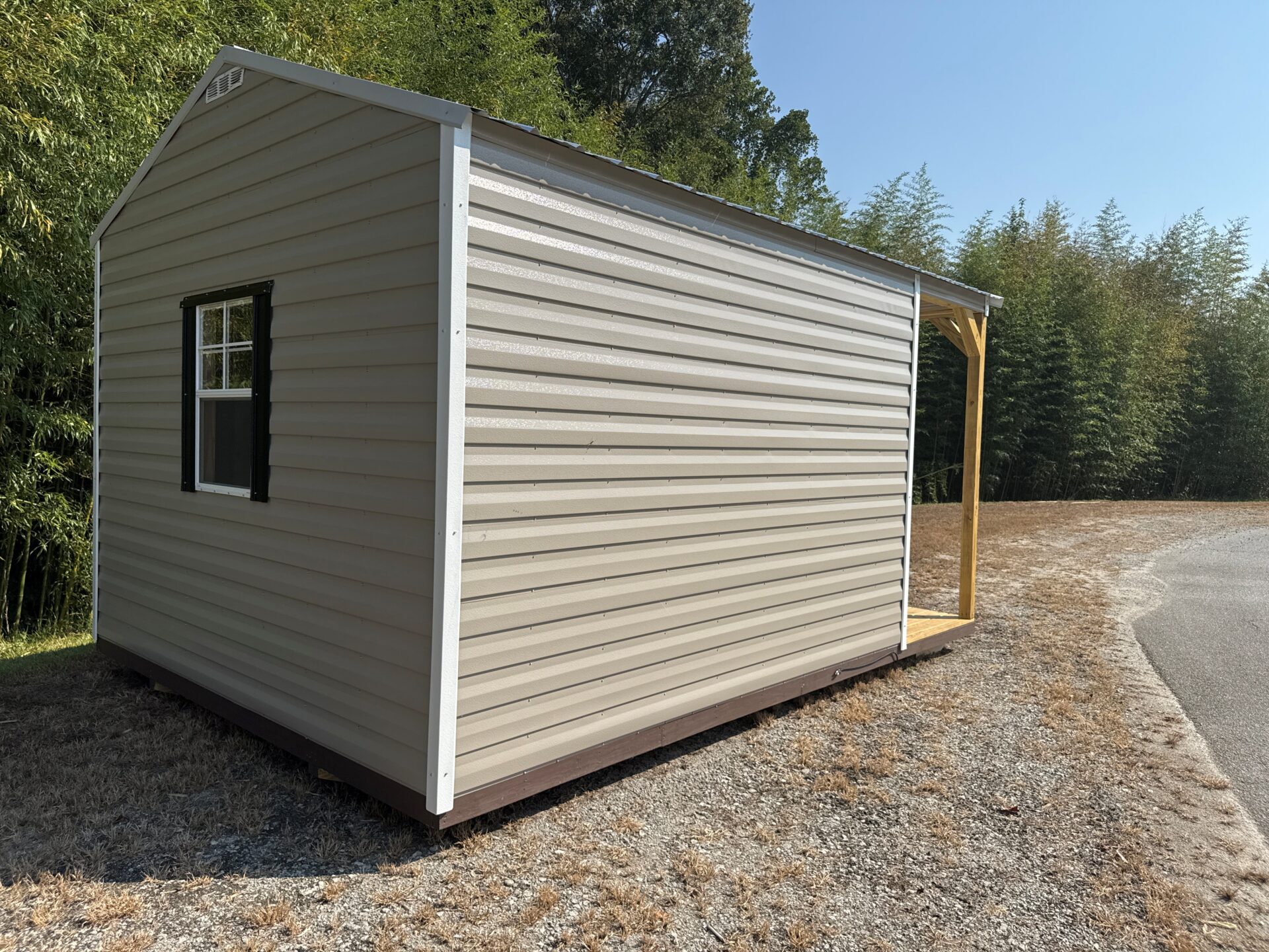 Our 12′ x 16′ Veranda Series (12′ x 12′ w/4′ Porch) is one of our entry level storage sheds. This unit has been upgraded to 7.5′ interior side walls, 16″ O.C. Studs, 3′ Single w/9-Lite fiberglass doors, steel lap exterior siding, and a 20 year GALVALUME® Steel roof.
