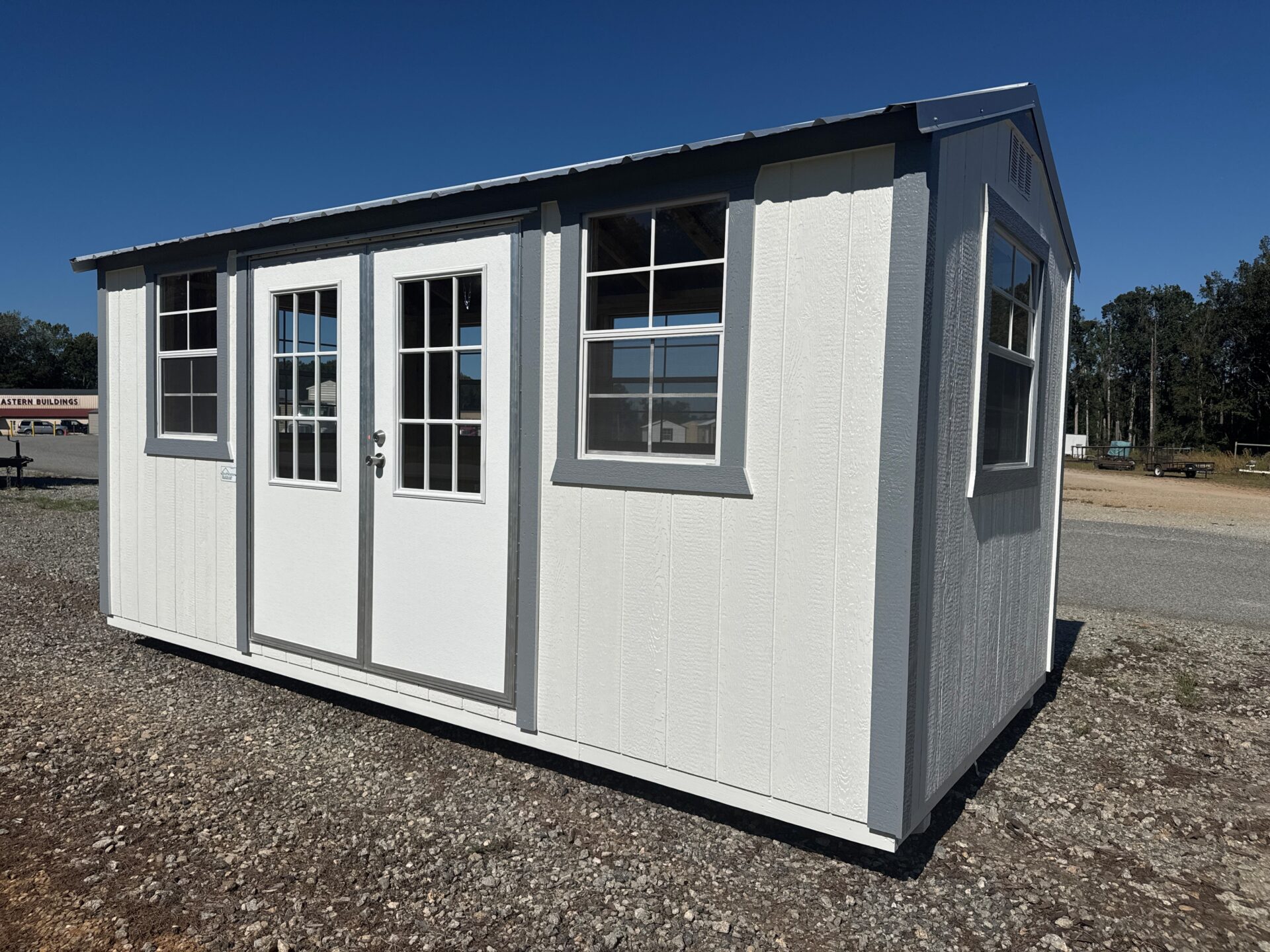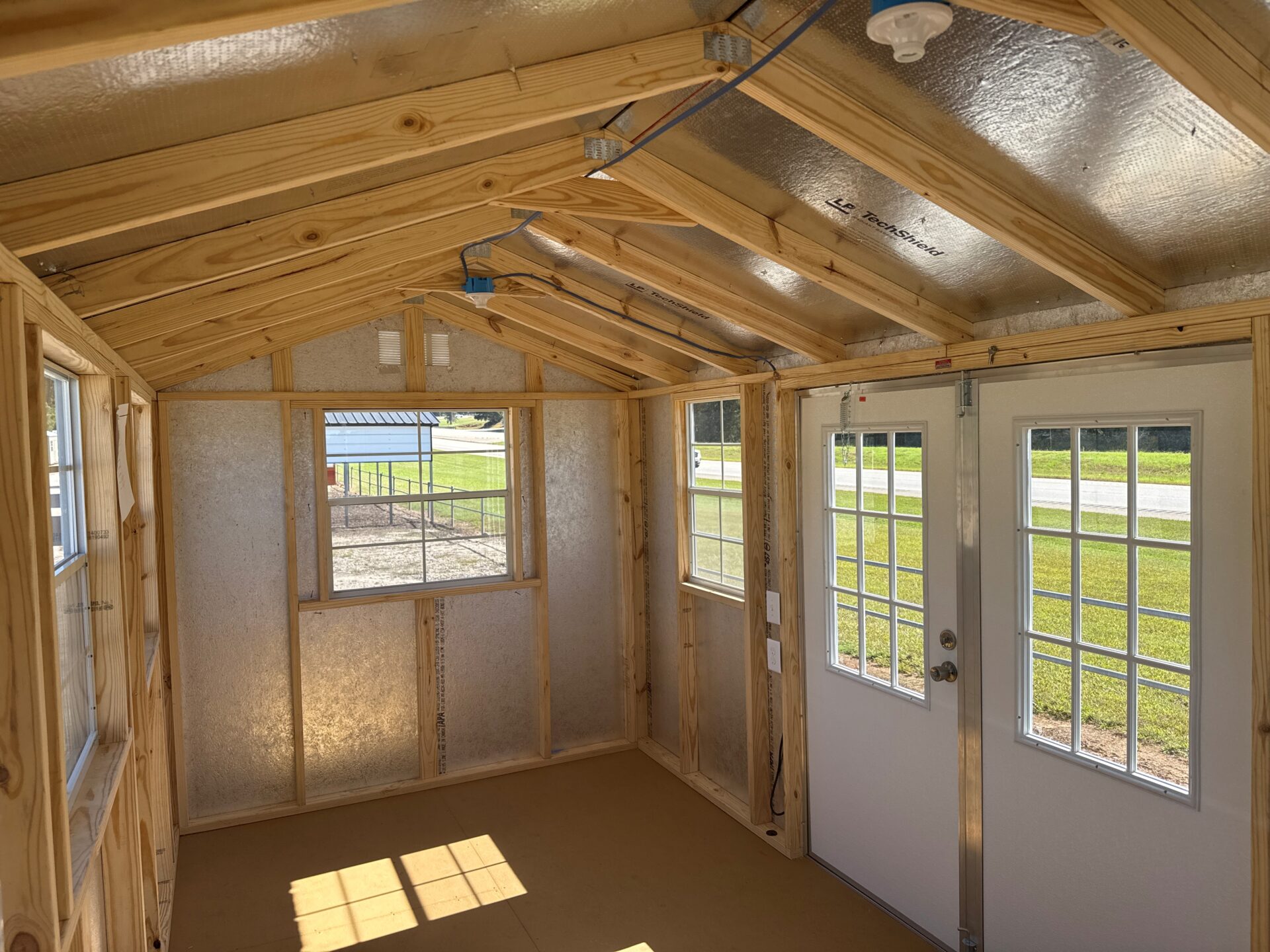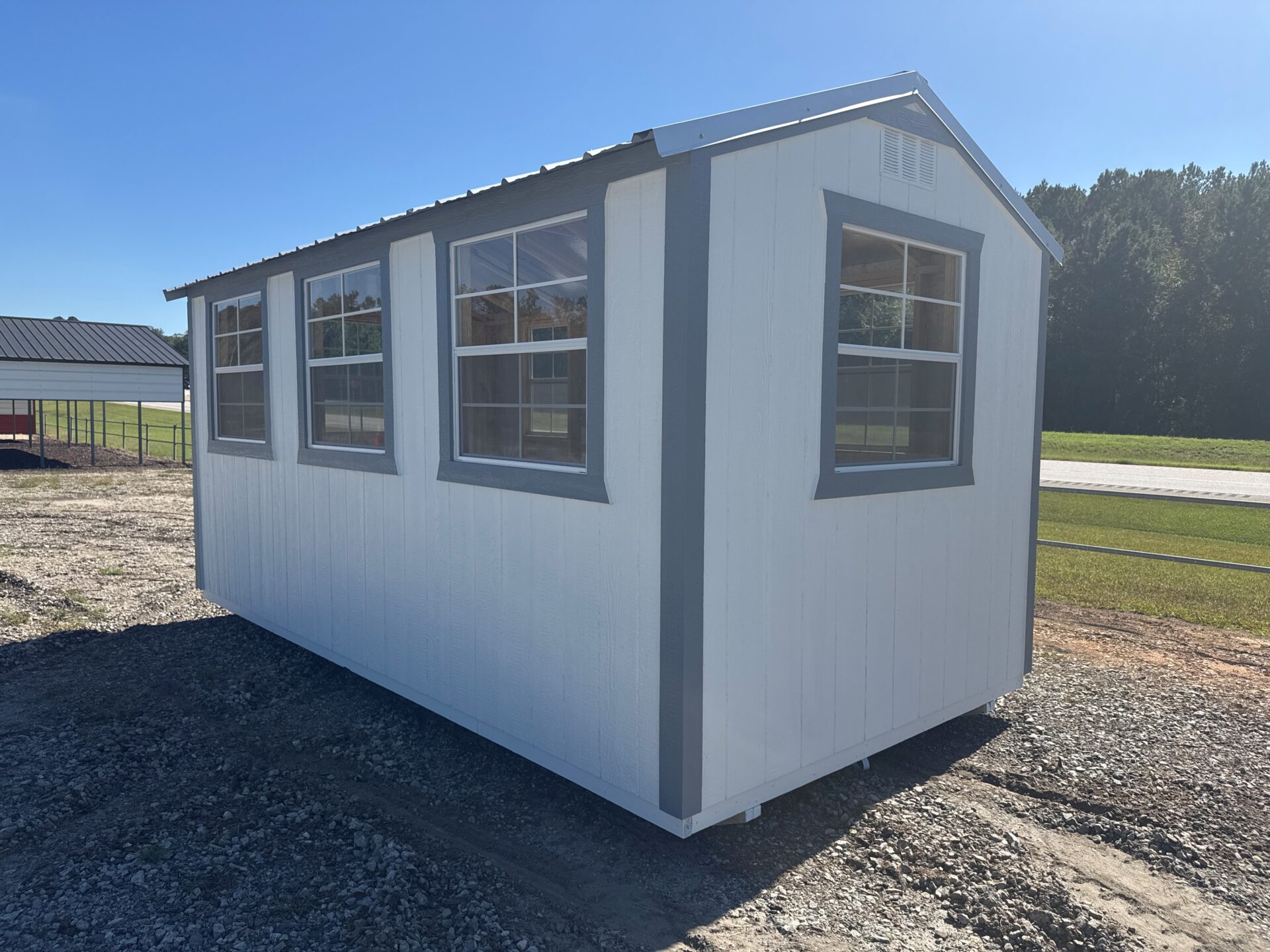 Our 8′ x 16′ Ridgeline Building is one of our most popular options. This unit comes with 6.5′ interior side walls, 6′ double wood door, 2 windows, LP Smart Siding w/Silvertech, painted & caulked exterior siding, OSB on the roof with Techshield, 5 – 2×3 & 2 – 3×3 Windows, and a 20 year Galvalume 29 gauge steel roof.